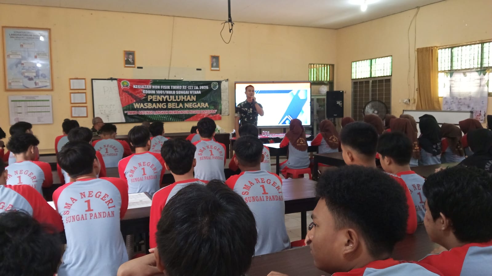 Amuntai – Satgas TNI Manunggal Membangun Desa (TMMD) ke-127 Kodim 1001/HSU–Balangan terus menunjukkan komitmennya membangun desa secara menyeluruh, tidak hanya melalui sasaran fisik, tetapi juga pembinaan ideologi, mental, dan karakter generasi muda. Komitmen tersebut diwujudkan melalui kegiatan Wawasan Kebangsaan yang digelar di SMAN 1 Sungai Pandan, Kecamatan Sungai Pandan, Kabupaten Hulu Sungai Utara, Selasa (24/02/2026).