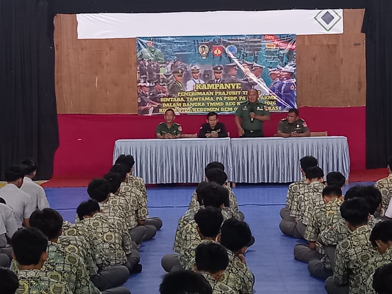 Kebumen – Dalam rangka menumbuhkan semangat bela negara dan pengabdian kepada bangsa, TMMD Reguler ke-127 Kodim 0709/Kebumen menggelar kegiatan Sosialisasi Rekrutmen TNI AD Tahun Anggaran 2026 bersama Ajenrem 072/Pamungkas. Kegiatan tersebut dilaksanakan di Aula SMA Negeri 1 Kebumen, Kamis (12/02/2026), dan diikuti oleh sekitar 350 siswa-siswi kelas XII.