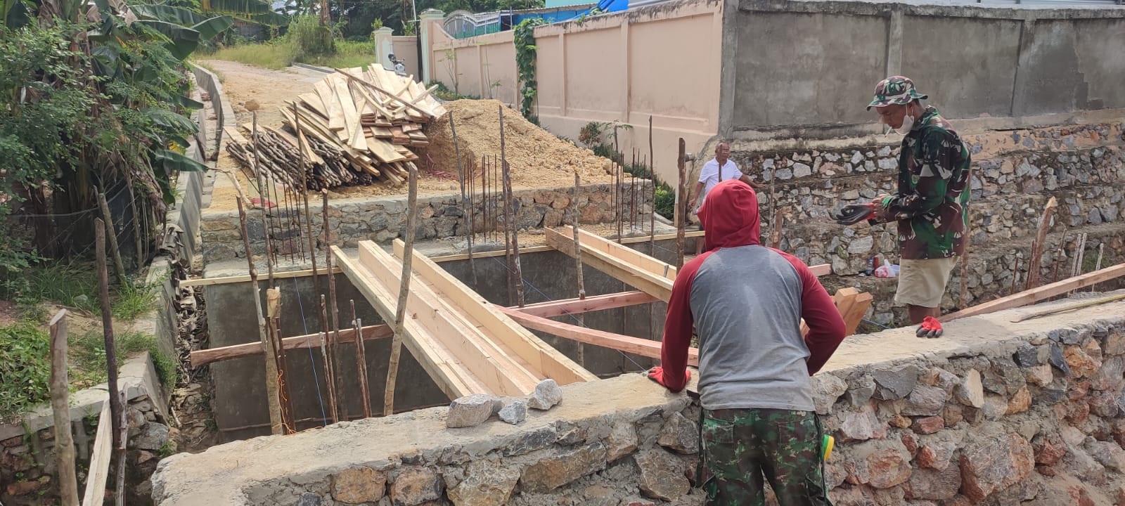 Kendari – Memasuki tahapan krusial dalam program TNI Manunggal Membangun Desa (TMMD) ke-127, personel Kodim 1417/Kendari mulai melakukan pemasangan papan mal pada proyek pembangunan jembatan di Kelurahan Anggoeya, Kecamatan Poasia, Kota Kendari, Kamis (19/2).