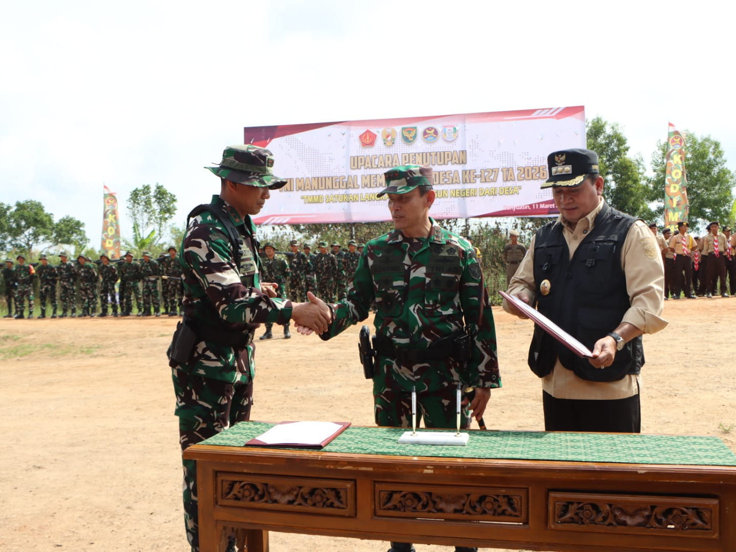 PULAU RIMAU – Bertempat di Lapangan SMP N 3 Desa Wonosari, Kecamatan Pulau Rimau, Kabupaten Banyuasin, berlangsung upacara penutupan program Tentara Manunggal Membangun Desa (TMMD) ke-127 TA. 2026 yang dihadiri langsung oleh Pangdam II/Swj, Mayjen TNI Ujang Darwis, M.D.A. Upacara ini diikuti oleh ratusan peserta dari unsur TNI, Polri, pemerintah daerah, tokoh masyarakat, serta masyarakat desa Wonosari.
