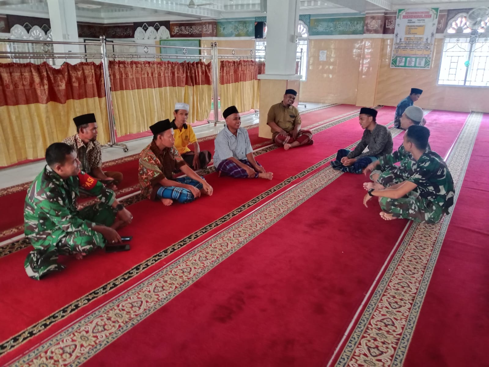 Usai sholat berjamaah, suasana keakraban dan kehangatan terasa saat para prajurit TNI dan warga duduk bersisian tanpa sekat, mencerminkan kebersamaan yang tulus dan penuh kekeluargaan. Kegiatan Komsos ini bertujuan untuk menjalin kedekatan, memberikan motivasi, dan mempererat hubungan antara TNI dan masyarakat.