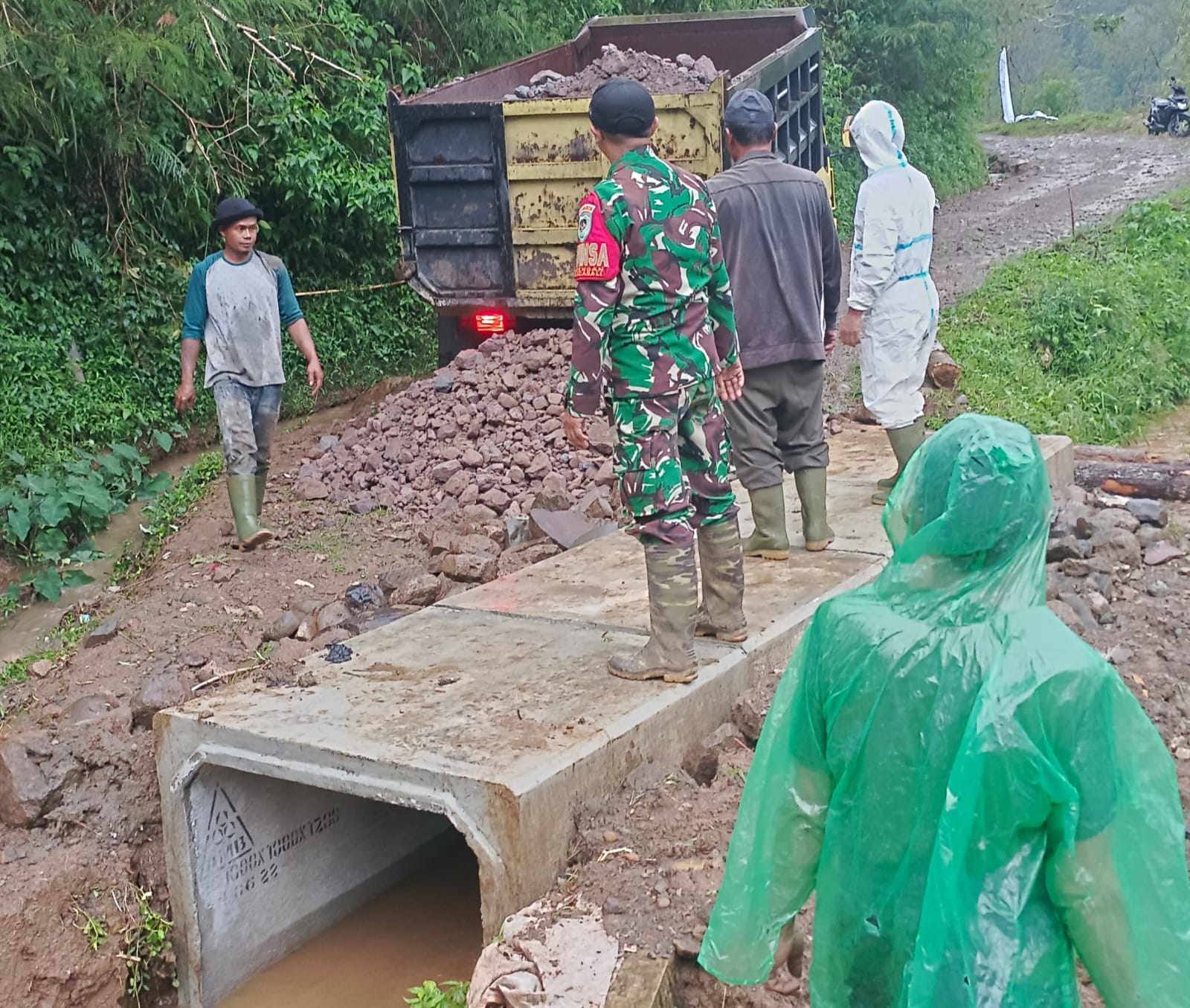 Kegiatan yang dimulai pukul 10.00 WIB dan melibatkan personel Satgas TMMD bersama masyarakat setempat ini bertujuan untuk mengatasi permasalahan genangan air yang sering terjadi di badan jalan. Pemasangan box culvert dilakukan dengan menggunakan alat berat untuk mengurai aliran air yang melintasi badan jalan, sehingga diharapkan dapat mencegah genangan serta kerusakan jalan di kemudian hari.