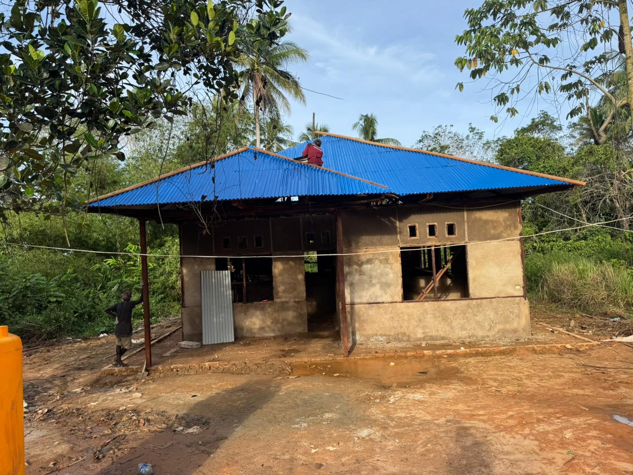 Pemasangan seng dilakukan dengan rapi, memberikan tampilan atap yang elegan dan modern. Sementara itu, pemasangan batu dan plester dinding terus dikerjakan untuk memberikan sentuhan akhir yang mempercantik tampilan rumah.