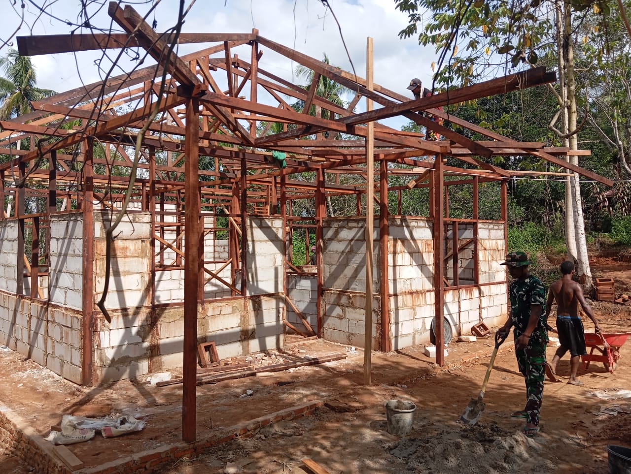 rangka atap rumah sudah berdiri kokoh. Satgas bersama warga mulai memasang balok kayu di bagian atas rangka. Dinding rumah yang terbuat dari batako juga sudah terlihat berdiri, menandakan bahwa pembangunan rumah sudah memasuki tahap akhir.