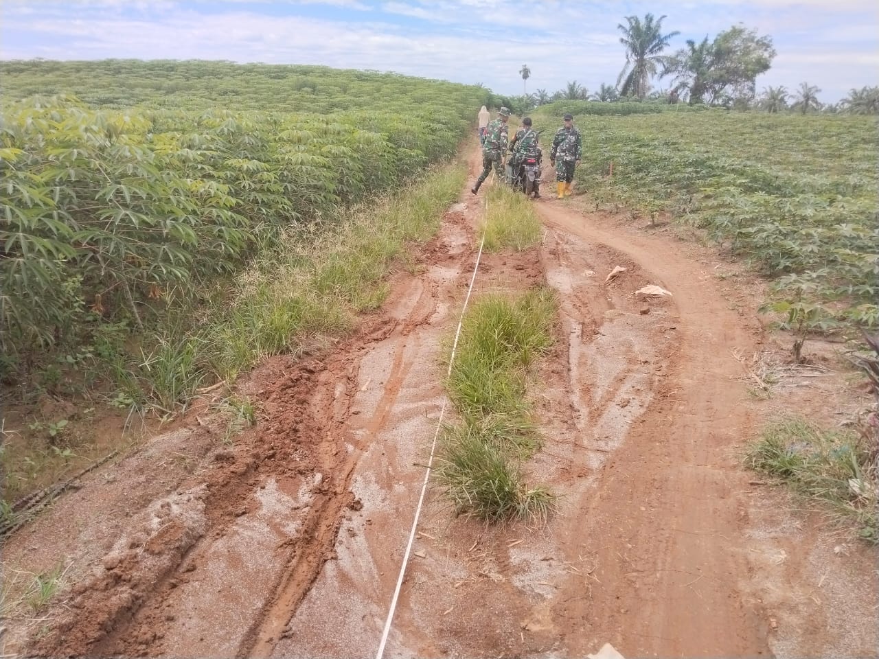 Di lokasi yang masih berupa jalan tanah dan berlumpur, terlihat sejumlah personel Satgas TMMD bekerja dengan alat ukur dan pita meter. Mereka memastikan bahwa jalur jalan yang akan dibangun benar-benar sesuai dengan perencanaan awal agar tepat sasaran dan memberikan manfaat maksimal.