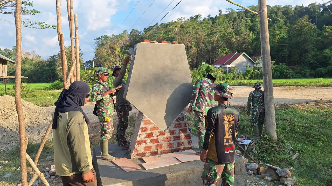 Konawe – Berkat keahlian para anggota Satgas TMMD, tugu TMMD 125 Kodim 1417/Kendari memasuki tahap plamir dengan bahan acian semen. Tugu tersebut berdiri di pertigaan jalan Desa Awua Jaya, Kec. Asinua, Kab. Konawe, Kamis (14/8).