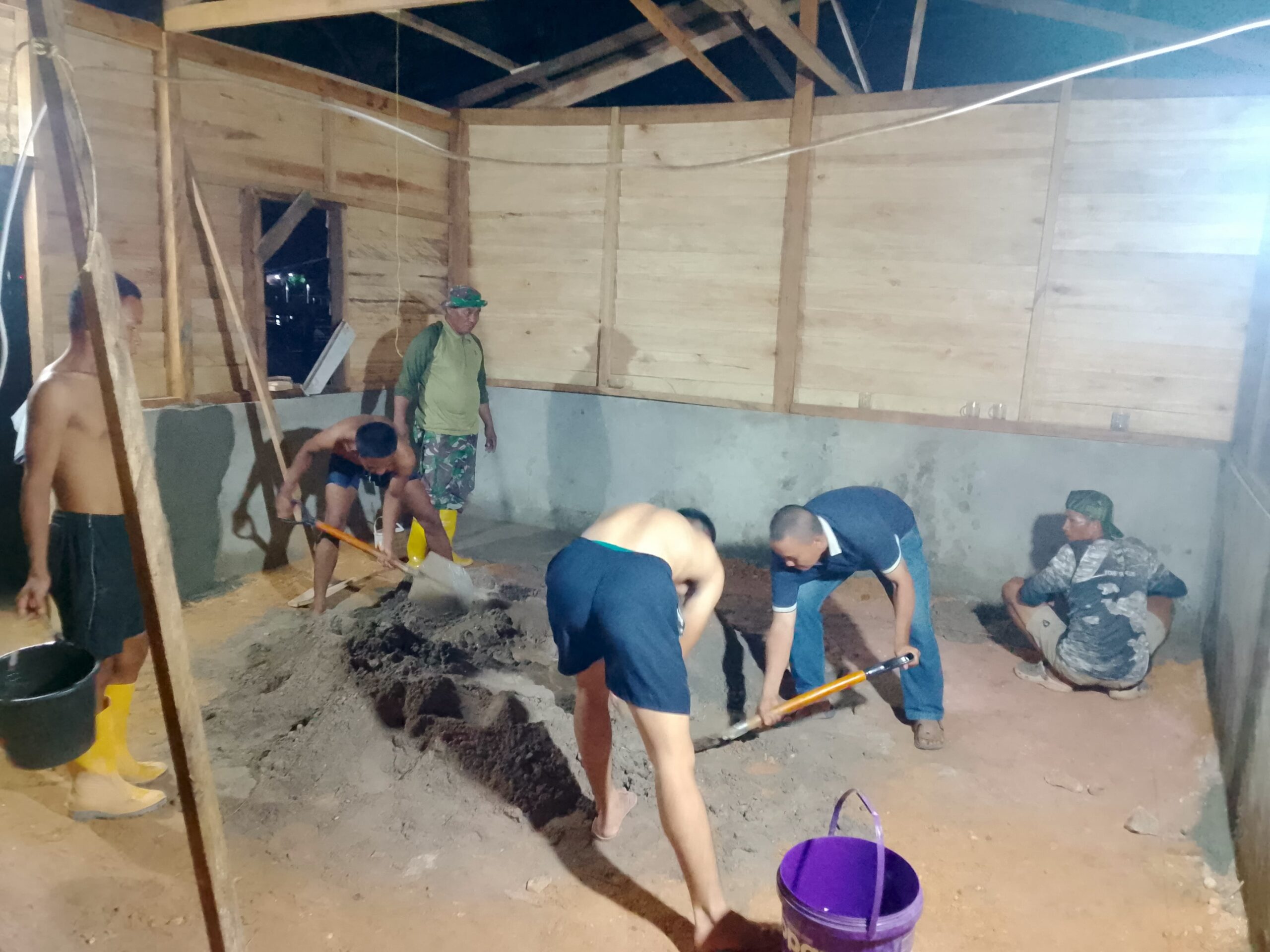 Para prajurit bahu-membahu melaksanakan pekerjaan fisik, mulai dari pemasangan rangka kayu bagian atas hingga proses perabatan atau pemeluran lantai gedung.